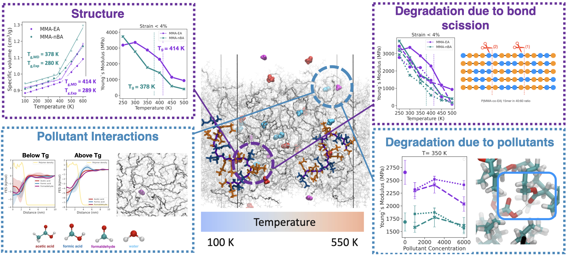 Although acrylics are favored for their durability among other artists’ paints, they can degrade over time by either chemical degradation due to light exposure or physical degradation due to interaction with volatile organic compounds (VOCs), water, or other impurities that cause structural changes in the acrylic material. Many experimental studies in the past have focused on characterization, degradation and conservation of acrylic paints in the context of conservation of cultural heritage, but not many attempts have been made in understanding the physical processes associated with structural changes that lead to degradation in acrylics. While chemical degradation commonly occurs in polymers, there might be many additional other means of degradation, such as due to disruption of polymer morphology. Our physics-based atomistic models focused on both structural changes in acrylic polymers and degradation mechanism as summarized in the figure below.